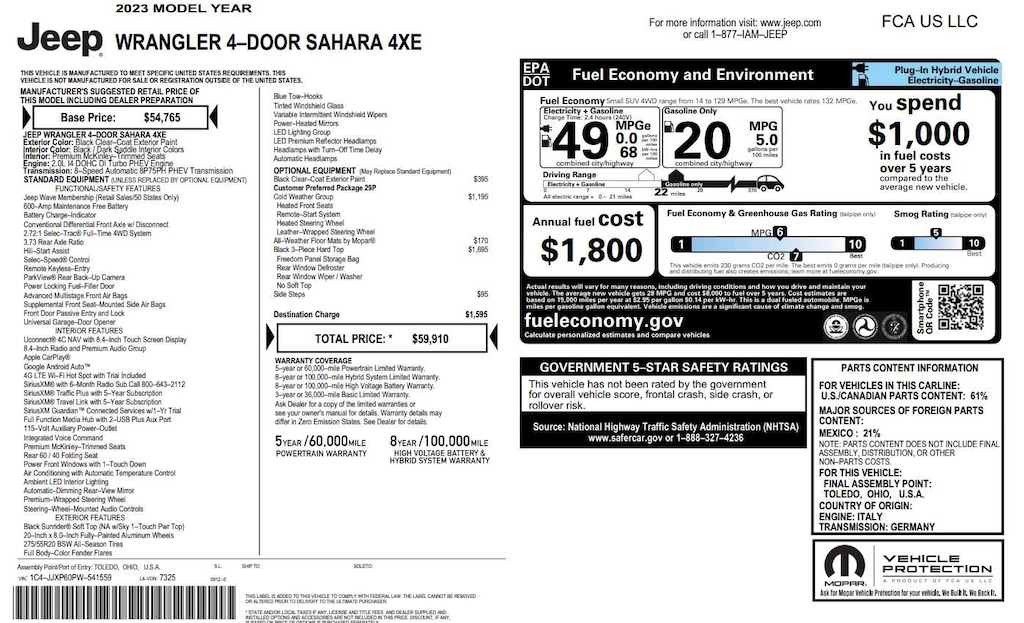 BLACK 3-PIECE HARD TOP Freedom Panel Storage Bag, Rear Window Defroster, Rear Window Wiper/Washer, COLD WEATHER GROUP Heated Steering Wheel, Remote Start System, Heated Front Seats, TRANSMISSION: 8-SPEED AUTO 8P75PH PHEV (STD), ENGINE: 2.0L I4 DOHC DI TURBO PHEV (STD).